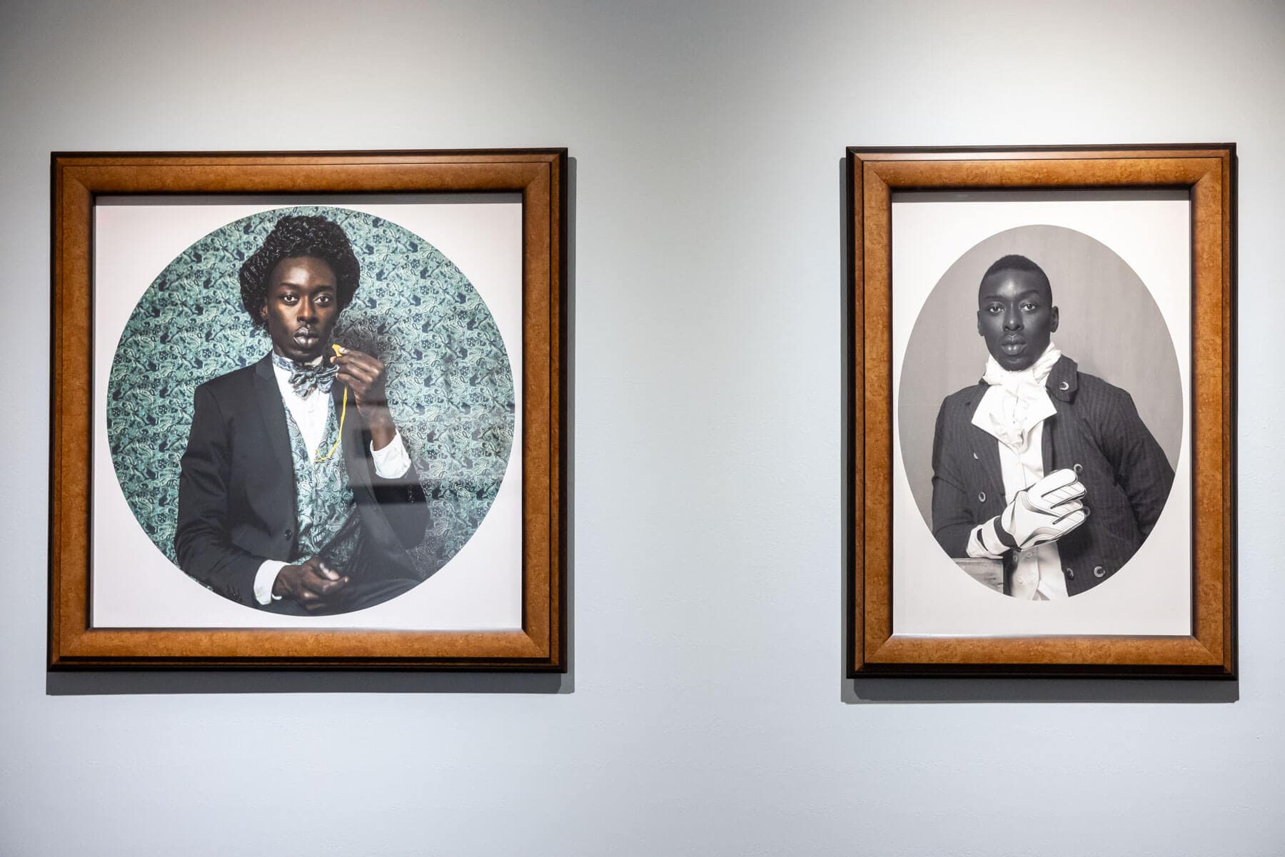 (left) Omar Victor Diop, Frederick Douglass, Diaspora series, 2015. 28.5 x 28.5 inches. (right) Omar Victor Dop, Oloudah Equiano, Diaspora series, 2014. 28 x 20 inches. Both pigment inkjet print on Harman by Hahnemhüle paper. Installation view, “Free as they want to be: Artists Committed to memory,” Ethelbert Cooper Gallery of African and African American Art. Photo by Melissa Blackall for the Ethelbert Cooper Gallery. Courtesy of the Ethelbert Cooper Gallery at Harvard University’s Hutchins Center for African and African American Research.