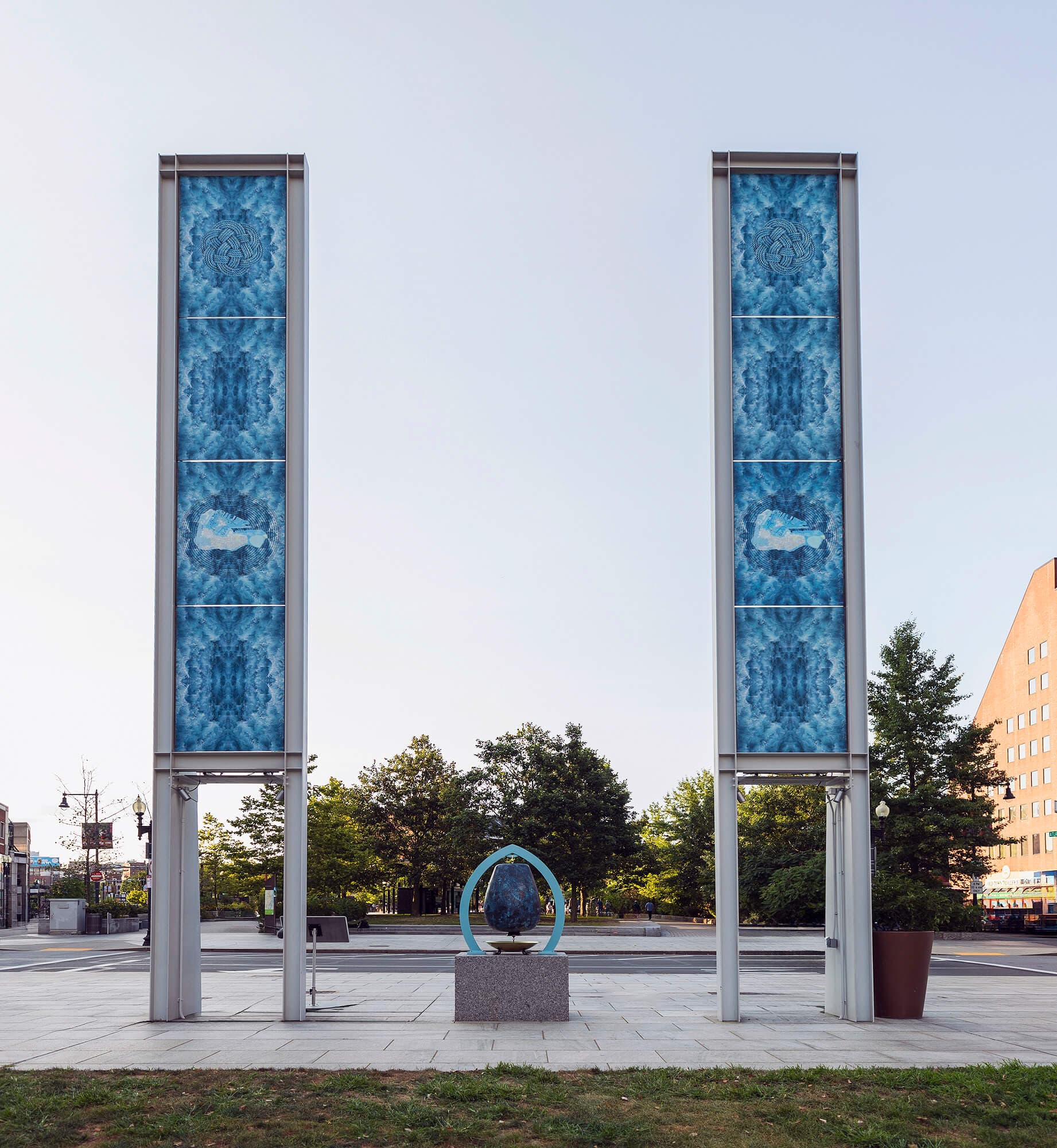 Lani Asunción, WAI Water Warning, Water Clock and Binakol Blessing Flag, 2024–2025. Photo by Mel Taing. Courtesy of the Rose Kennedy Greenway Conservancy.
