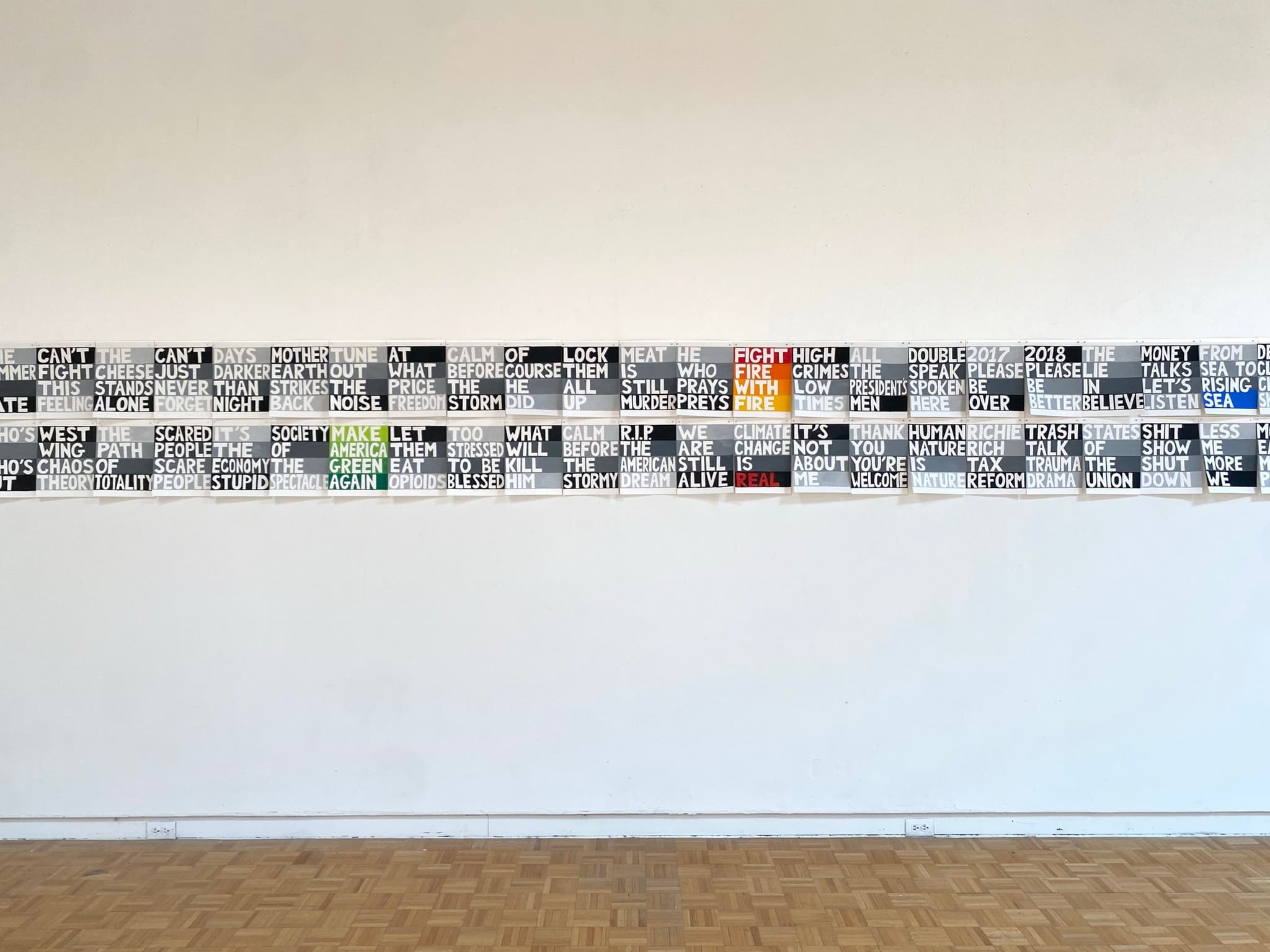 Surrounding the sweater installation are 244 drawings from Auerbach’s 4-Word Drawing series. Predominantly in gray and white, and made from 2016 to 2020, the gouache and pencil drawings are all 12″ x 19″. Auerbach created each drawing with exactly four words in the same composition, which she then posted on Instagram to raise money for activist causes in response to the Trump administration. Funds benefited groups including the Trevor Project (support for LGBT youth), Anti-Defamation League, Planned Parenthood, Central American Resource Center (CARECEN), and the Green City Force. Some examples of texts are Art of No Deal, This Too Shall Pass, Kicking Against the Pricks, and Make America Green Again. The drawings clearly fall in the tradition of works by Jenny Holzer and Barbara Kruger, but Auerbach’s use of social media as a platform for distributing these messages and fundraising for advocacy groups adds a dimension of wit and activism.