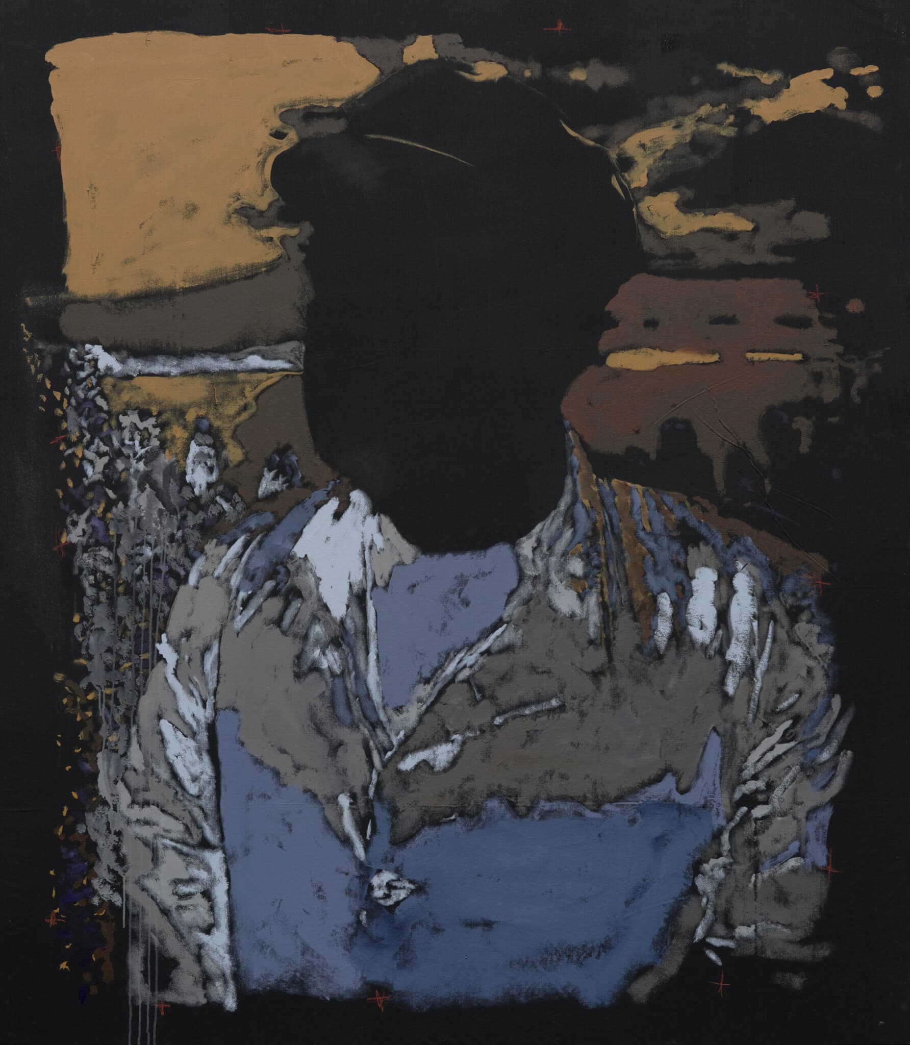 The power of material to transform from everyday object to poetry through the alchemical mediation of the artist is at the heart of Hodges’s practice. His paintings are unapologetically physical. Painting with radiant, declarative opaque marks on a rich black ground, and using linen that continually announces its utilitarian origins, Hodges is known for his images of people in motion. The speeds of his figures vary, and sometimes contain meditative stillness, but, as in his approach to materials, there is always an undercurrent of embodied energy. His work rejects figurative painting’s potential for a meek retreat into recessive depth in favor of a powerful statement of emergent forward motion. The compositions advance into the spaces they inhabit like the light of sunrise moving into a darkened chamber.
